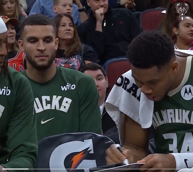 第三节末,坐在替补席的字母哥拿着战术板,认真地画起了战术。一开始旁边的特纳只是在听,最后也忍不住在战术板上指点起来。